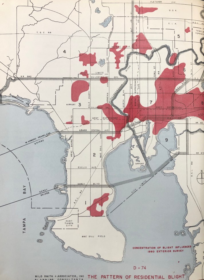 As early as the 1920’s, city planners posited emerging Black neighborhoods in what are today called East Tampa and West Tampa, while the historic Black neighborhoods of Dobyville and the Scrub have since been dismantled. Sulphur Springs, which experienced a later demographic shift, appears in maps showing blight from the 1960’s. From segregation, to redlining, to the destructive imposition of interstate highways, the repeated undermining of Tampa’s Black neighborhoods precipitated the present vulnerabilities.