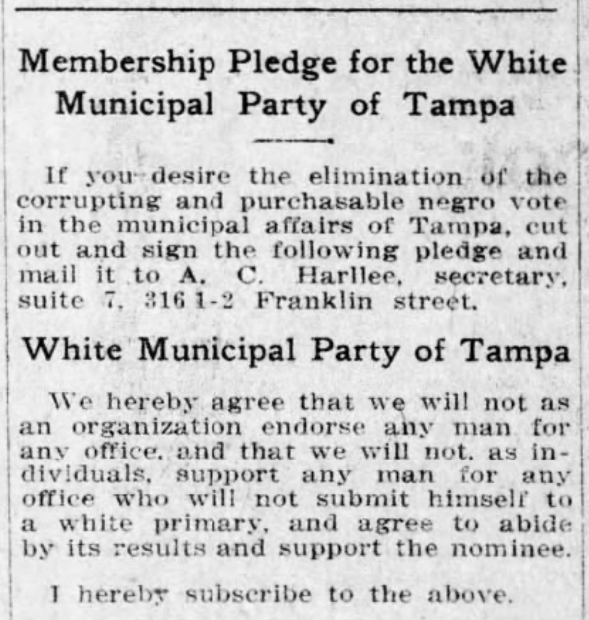 Tampa was not immune from the moral corruption of racial prejudice that pervaded the South after the Civil War. Tampa’s white elite secured the exclusion of Black residents from political participation during the Jim Crow era with the organization of the White Municipal Party. Long barred from affecting political change and segregated into neighborhoods with substandard housing, facilities, and amenities, the echoes of this shameful past reverberate through the decades to the present day and set the backdrop for Tampa’s current problem.